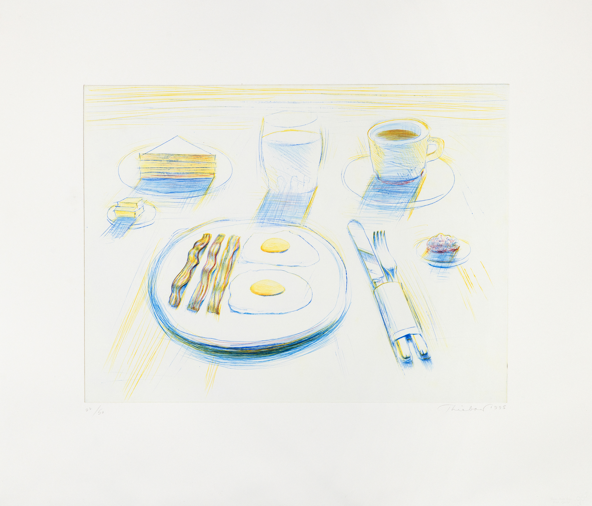 Since the early 1960s, Thiebaud has been celebrated for his depictions of food—cakes, pies, gumball machines, and diner counters—rendered not as literal meals but as cultural icons, at once nostalgic and idealized. In Breakfast, the modest meal is transformed into a subject of contemplation and delight, celebrating the pleasures of everyday American life while evoking memory and desire. The combination of precision and informality speaks to Thiebaud’s ability to merge the immediacy of drawing with the enduring resonance of painting.