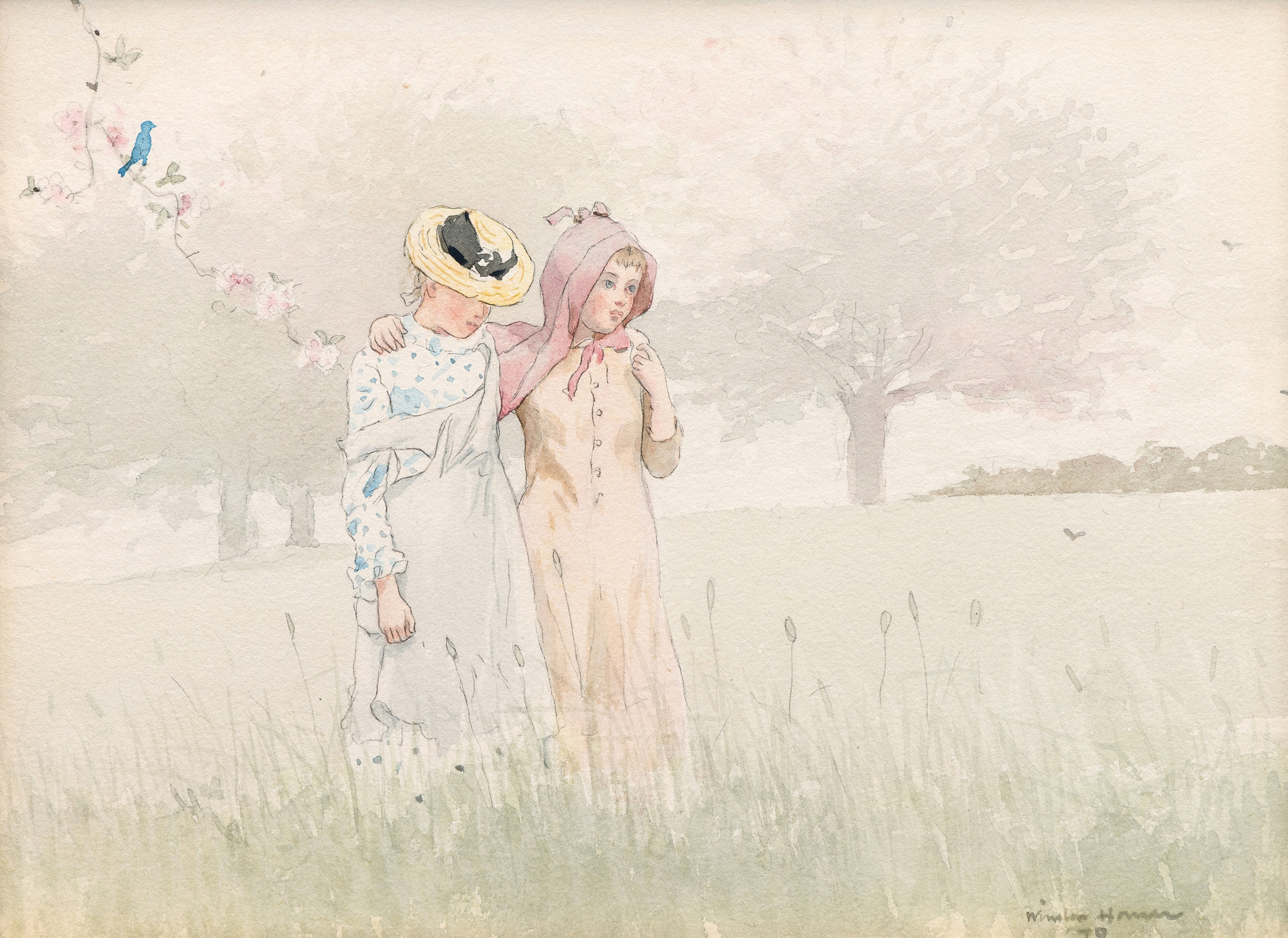 Lloyd Goodrich and Abigail Booth Gerdts, Record of Works by Winslow Homer, Volume III: 1877 through March 1881, New York, 2005, p. 258, no. 850 (illustrated)This watercolor is included in the artists catalogue raisonne and relates closely to other early examples from Houghton Farm, including Fresh Air from 1878 in the collection of the Brooklyn Museum. Its serene orchard scene, rendered with a soft and muted palette, reflects the themes of nostalgia, calm, and peace that define Homer's Restoration period. The transparency of the watercolor medium allows Homer to create a delicate, atmospheric impression of a misty morning, animated by touches of bright color in the figures dress patterns, the bow on a hat, a headwrap, and the bluebird perched on a branch.