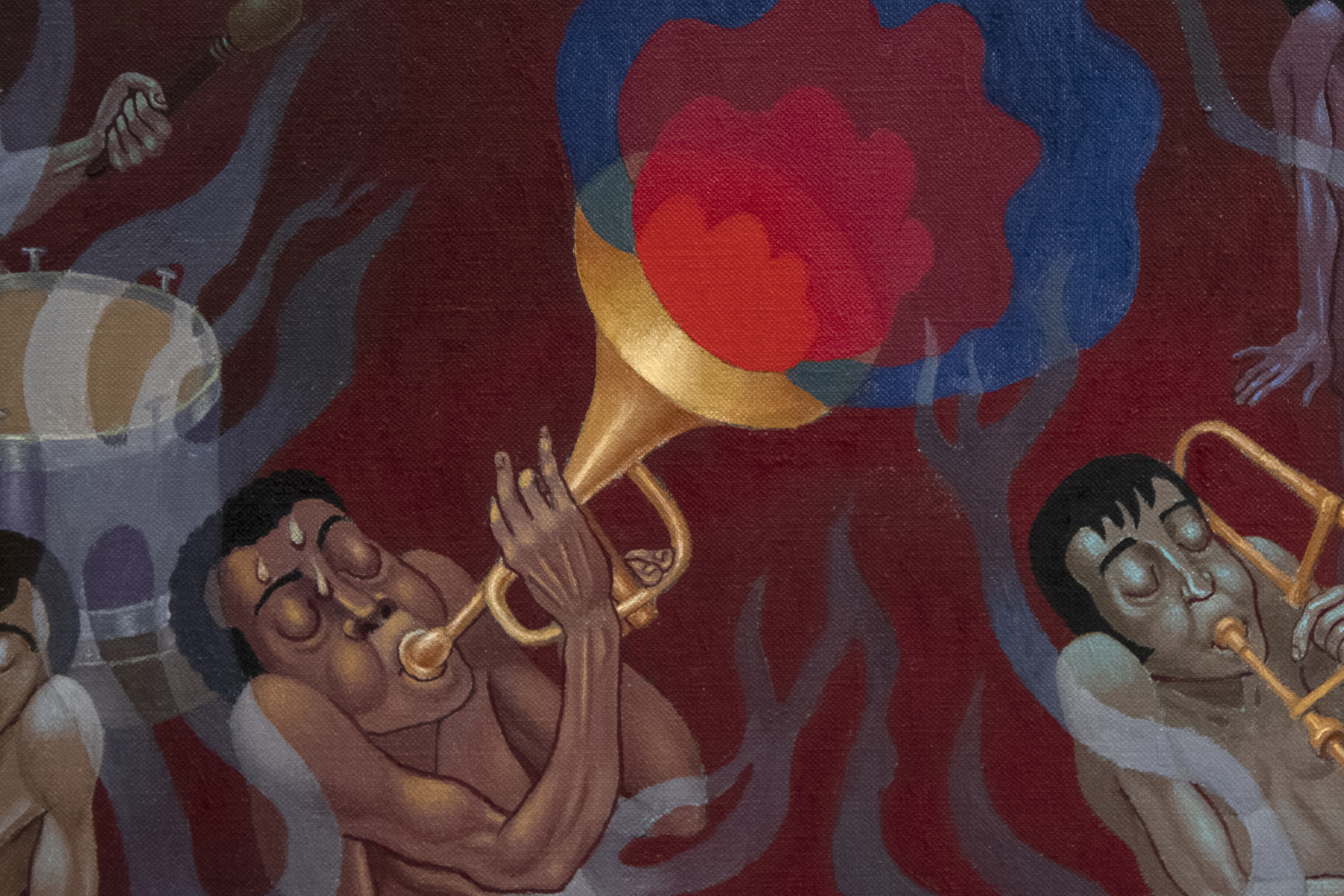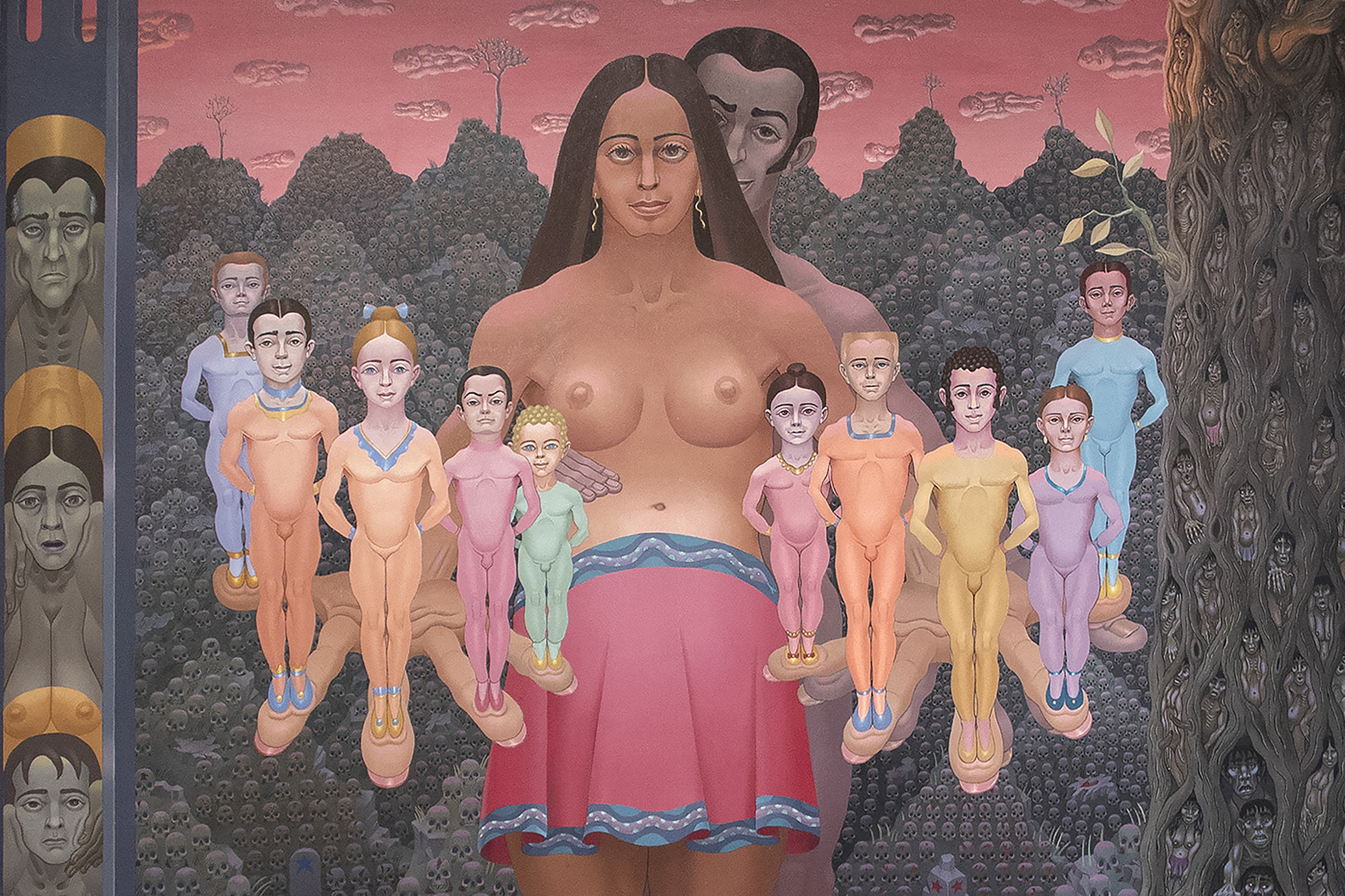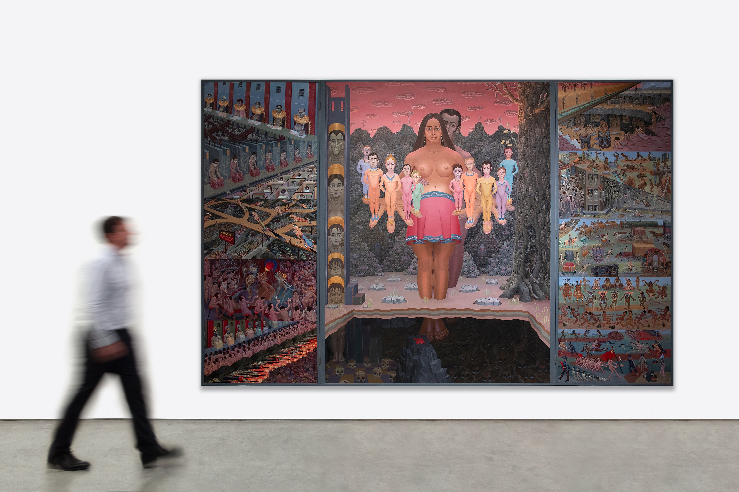 Here, Norman underscores a hopeful, if not optimistic, vision for generations ahead. The structural decision suggests a deliberate shift in focus: the darker scenes relegated to the sides represent the burdens, past and present. At the same time, the central figures embody the potential for a future shaped by resilience and renewal. This juxtaposition distinguishes The Human Condition as a reflection of Norman's later years, where a tempered hope emerges to claim the high ground over the war-mongering, abject corruption, frantic pleasure-seeking, and the dehumanizing effects of modern society.