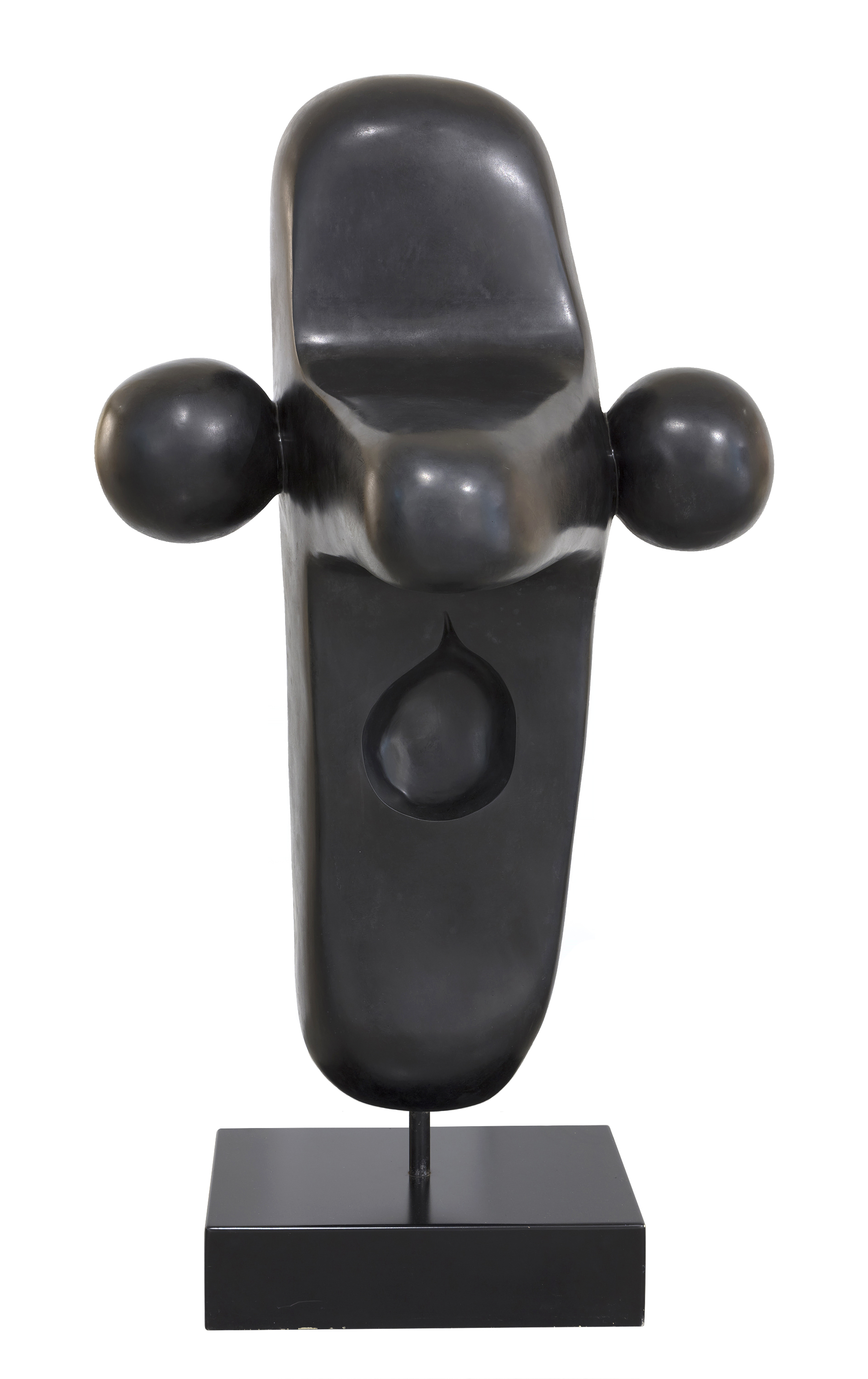 Tête de femme is based upon one of Miró’s most utilized themes. He characterized his sculptures as being from the ‘truly phantasmagoric world of living’ which is, undoubtedly, intended as a term of endearment. Yet Tête de femme seems to evince something less monstrous or grotesque and instead presents in more sobering light as a free-standing, monolithic presence suggesting essential nature, if not a monumental one. Its attributions are fixed, intrinsic, and suggestive of its innateness; a strikingly austere design that adheres to Miró’s resistance to a classic bourgeois concept of ideal beauty. While it does not suggest a simple ‘female figure’ designation, there is plenty of referential material in the curves, domed protrusions, and a central depression suggesting a birthing matrix that in sum, evokes a celebration of fecundity and the creation of life. In any event, any tether to representational reality is a tenuous one, yet one that is calculated to stimulate the imagination and evoke unconscious primordial references and long-forgotten mythologies.