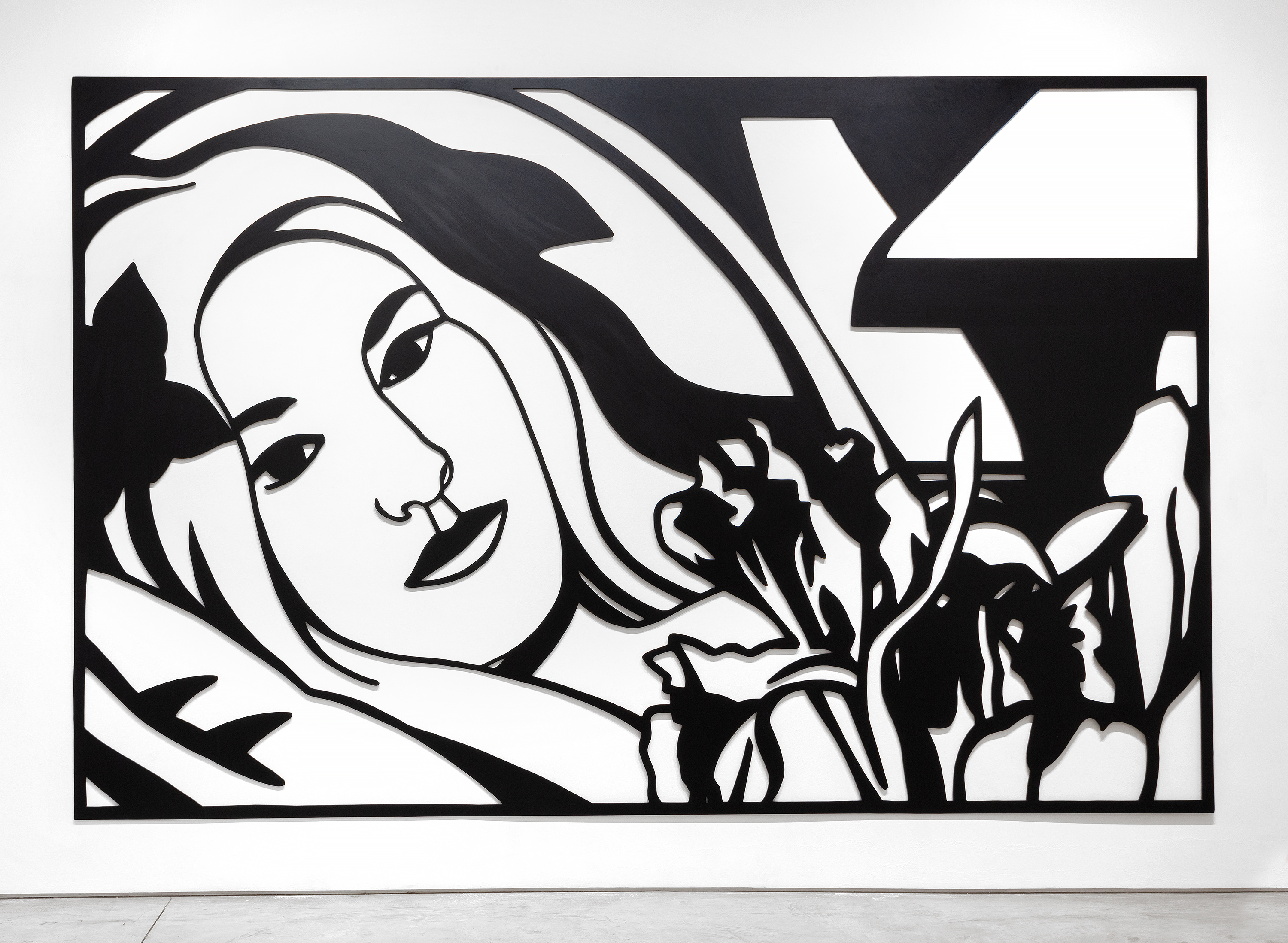 Bedroom Brunette with Irises is a Steel Drawing masterwork that despite its uber-generous scale, utilizes tight cropping to provide an unimposing intimacy while maintaining a free and spontaneous quality. The figure’s outstretched arms and limbs and body intertwine with the petals and the interior elements providing a flowing investigative foray of black lines and white ‘drop out’ shapes provided by the wall. It recalls Matisse and any number of his reclining odalisque paintings. Wesselmann often tested monochromatic values to discover the extent to which color would transform his hybrid objects into newly developed Steel Drawing works and, in this case, continued with a color steel-cut version of the composition Bedroom Blonde with Irises (1987) and later still, in 1993 with a large-scale drawing in charcoal and pastel on paper.