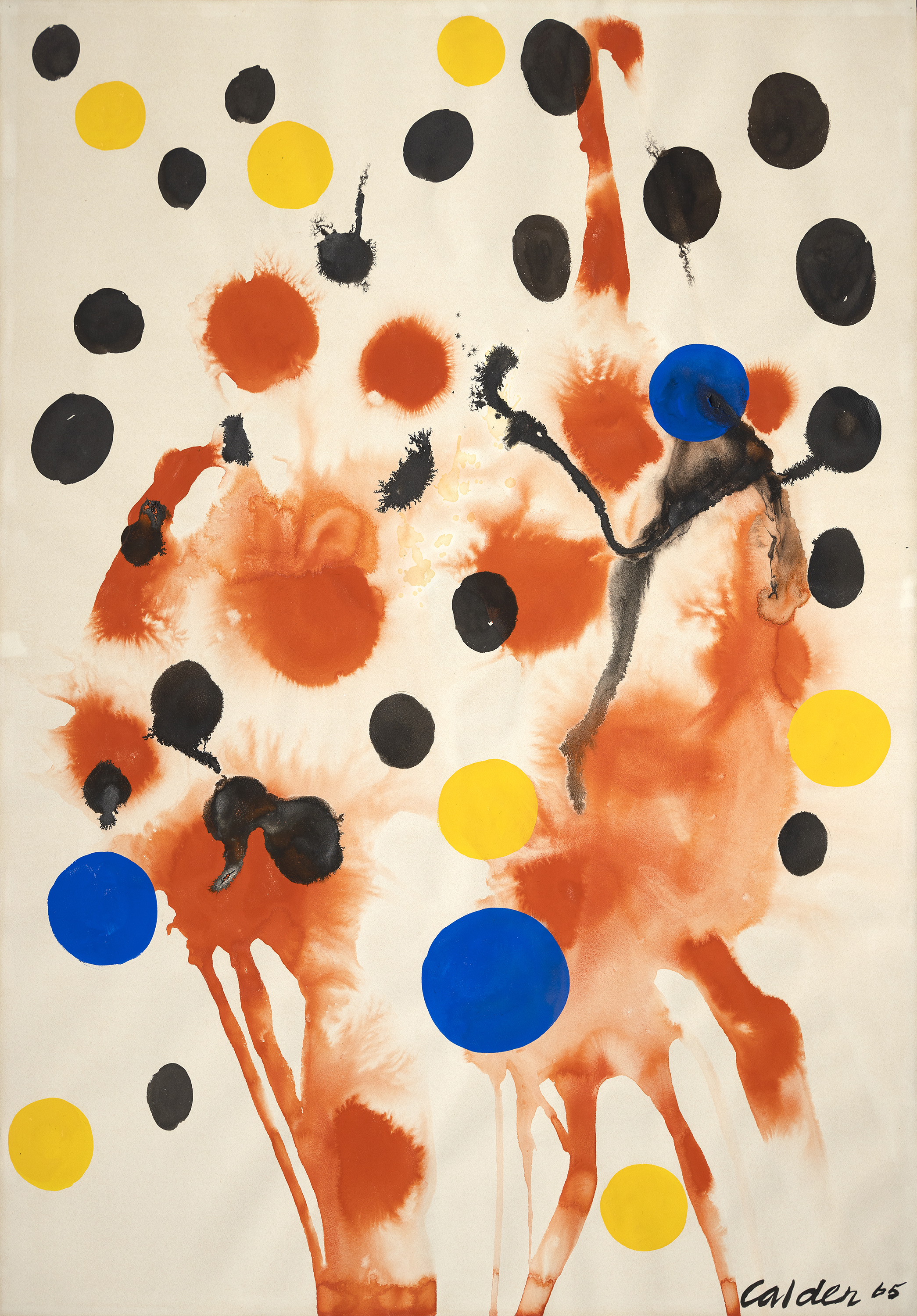 Alexander Calder's Rouge Mouille (Wet Red) features a background of red circles, some dispersing like explosions, creating a sense of energetic expansion, and others running downward as if streaming trails of a firework display. This animated backdrop is adorned with numerous opaque round balls, predominantly black, but interspersed with striking blue, red, and subtle yellow spheres. The strategic placement of the colorful spheres against the explosive reds captures the awe and spectacle of a fireworks show, transforming the painting into a visual metaphor for this dazzling and celebratory event. The artwork resonates with excitement and vibrancy, encapsulating its ephemeral beauty in a static medium.