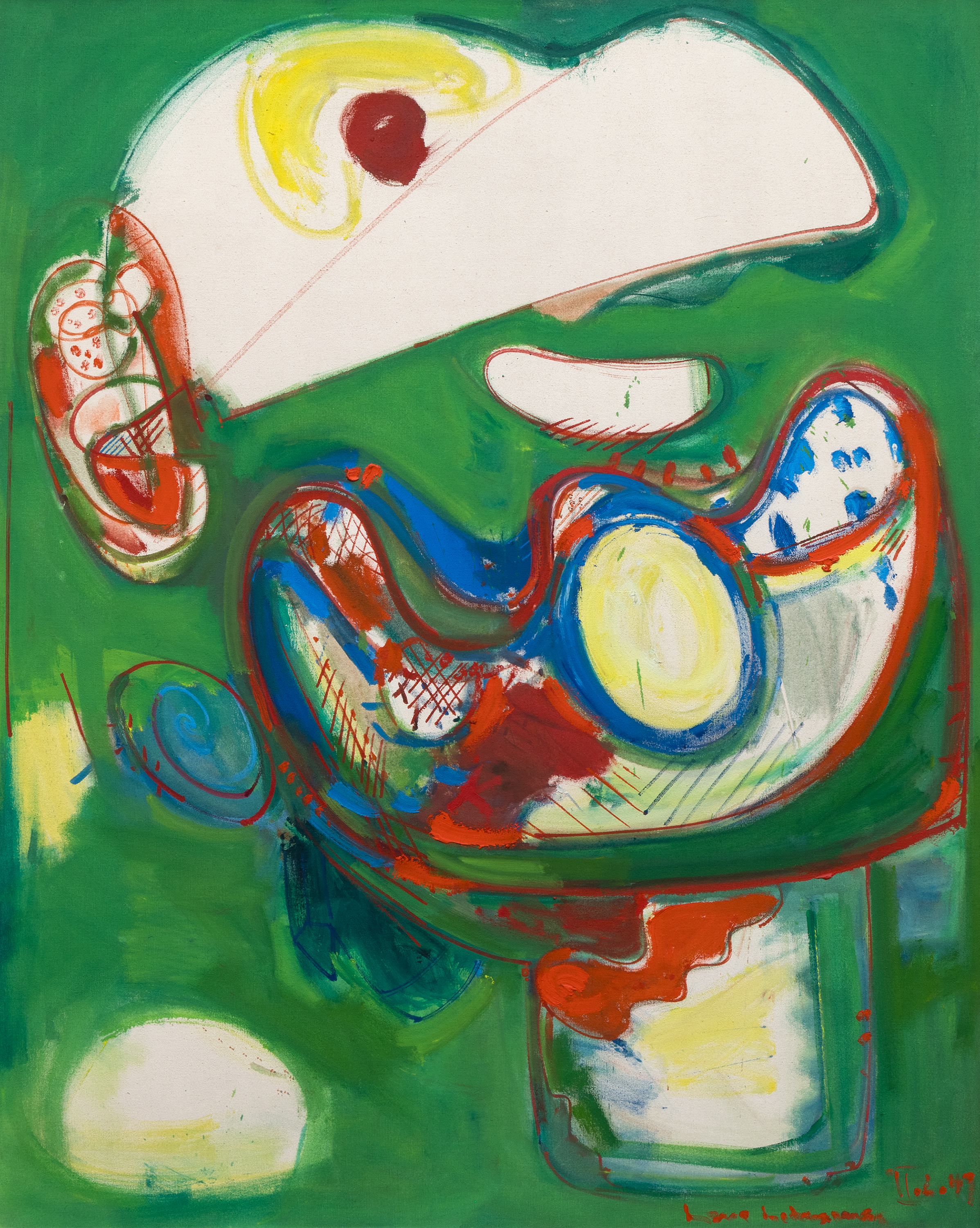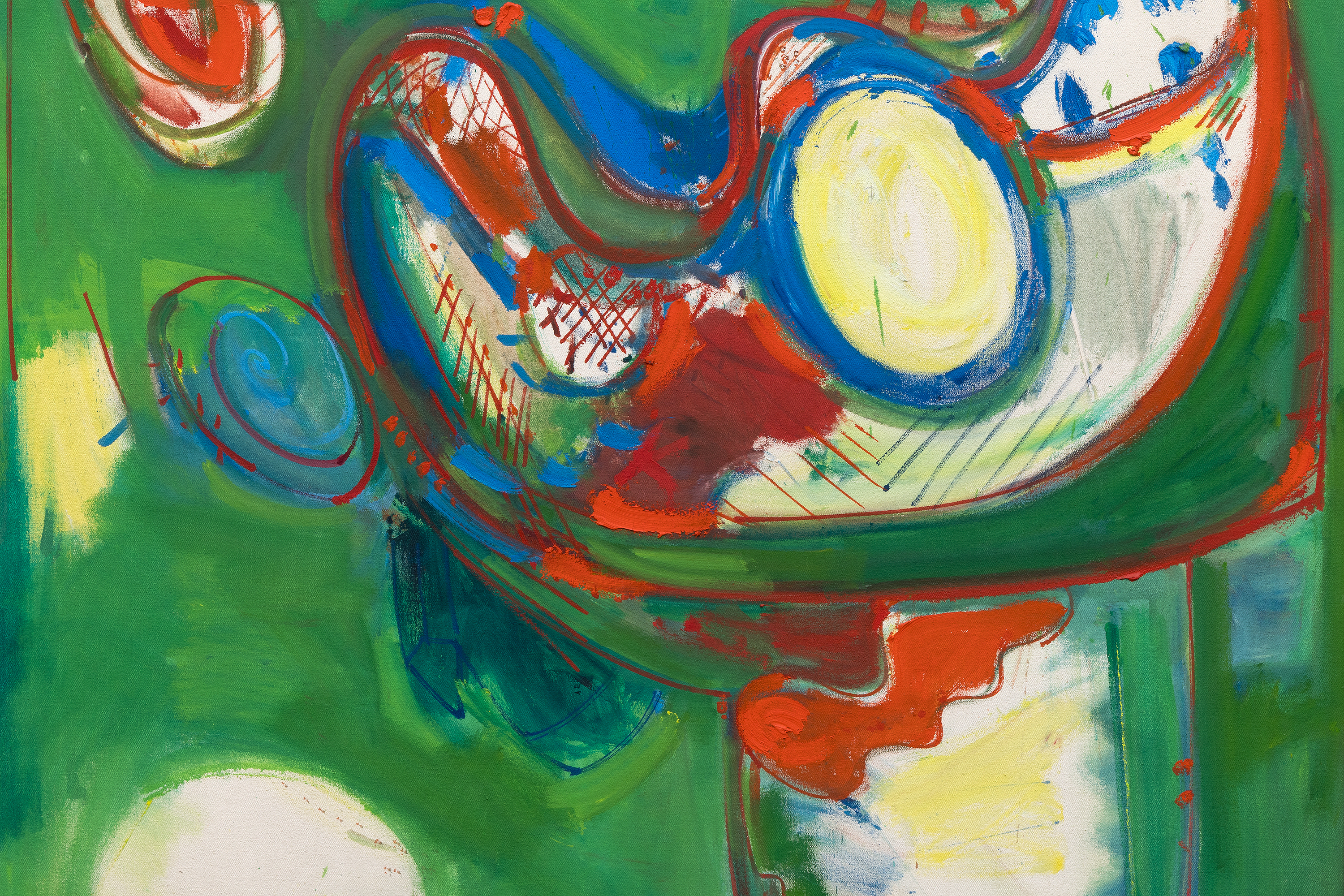 Painted at age 65, Baal also showcases Hofmann's willingness to revisit earlier disciplines while addressing the challenges of mid-century abstraction. Its vibrant palette and bold use of complementary colors, particularly the juxtaposition of red and green, heightens the painting's dynamism. His muscular brushwork also reflects his lifelong experimentation with the tension between form and freedom; undulating lines and biomorphic forms evoke the surrealist influence of Miró and the spiritual resonance of Kandinsky's gestural abstractions. Like these predecessors, Hofmann sought to translate "inner necessity" into visual expression, guided by his fertile imagination. Yet the planal elements and curvilinear shapes of Baal also reflect the influence of improvisational painting, a hallmark of Abstract Expressionism as practiced by contemporaries like Arshile Gorky, among others. It is a composition that teems with movement and energy, suggesting a cosmos in flux—chaotic yet deliberate.