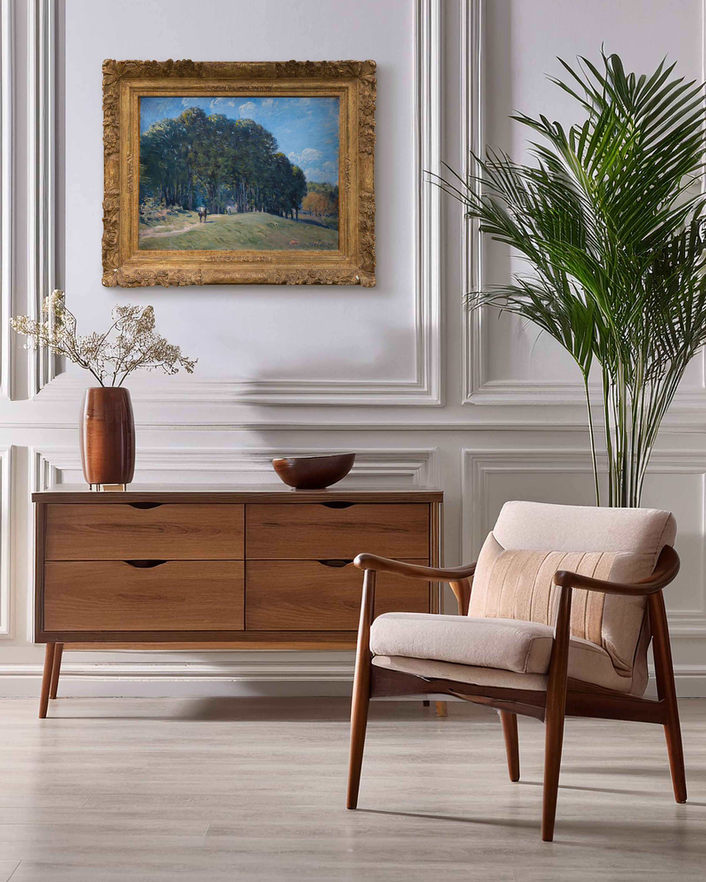 Alfred Sisley’s Cavalier en lisière de forêt (Horseman on the Edge of the Forest), from 1875, is a luminous painting depicting a tranquil road near Marly-le-Roi, where Sisley found creative renewal after moving from Paris’s Batignolles quarter. This work, included in the 2021 catalogue raisonné of the work of Alfred Sisley prepared by Francois Daulte with Galerie Brame & Lorenceau and the Comité Alfred Sisley as no.196, showcases his unrivaled commitment to plein-air painting, even compared to Impressionist peers like Monet and Pissarro. Likely executed entirely outdoors, it captures the immediacy of a summer morning with feathery brushstrokes of muted greens, ochres, and blues, rendering a path winding into a forest, a lone horseman, and two figures—one with a parasol.