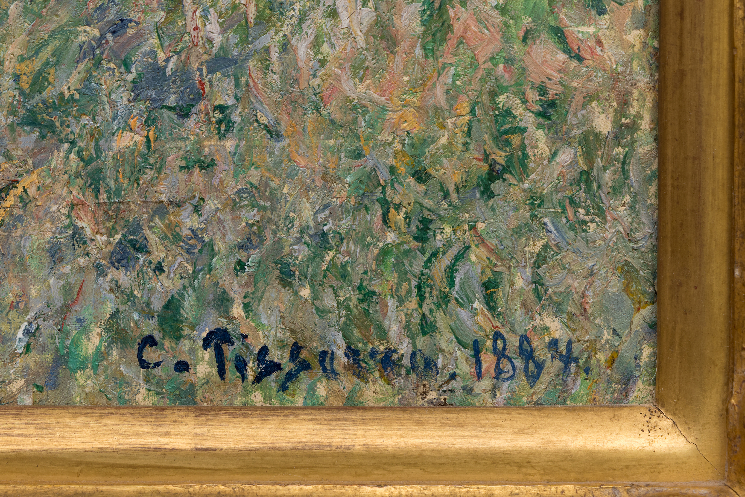 The foreground features a polychrome meadow. The staccato green, ochre, and lilac brushstrokes in all directions convey the wind’s gentle movement through the field beneath a fleecy sky. In the distance, the Delafolie brickyard emerges, owned by Pissarro’s good friend and neighbor. The catalogue raisonné notes: