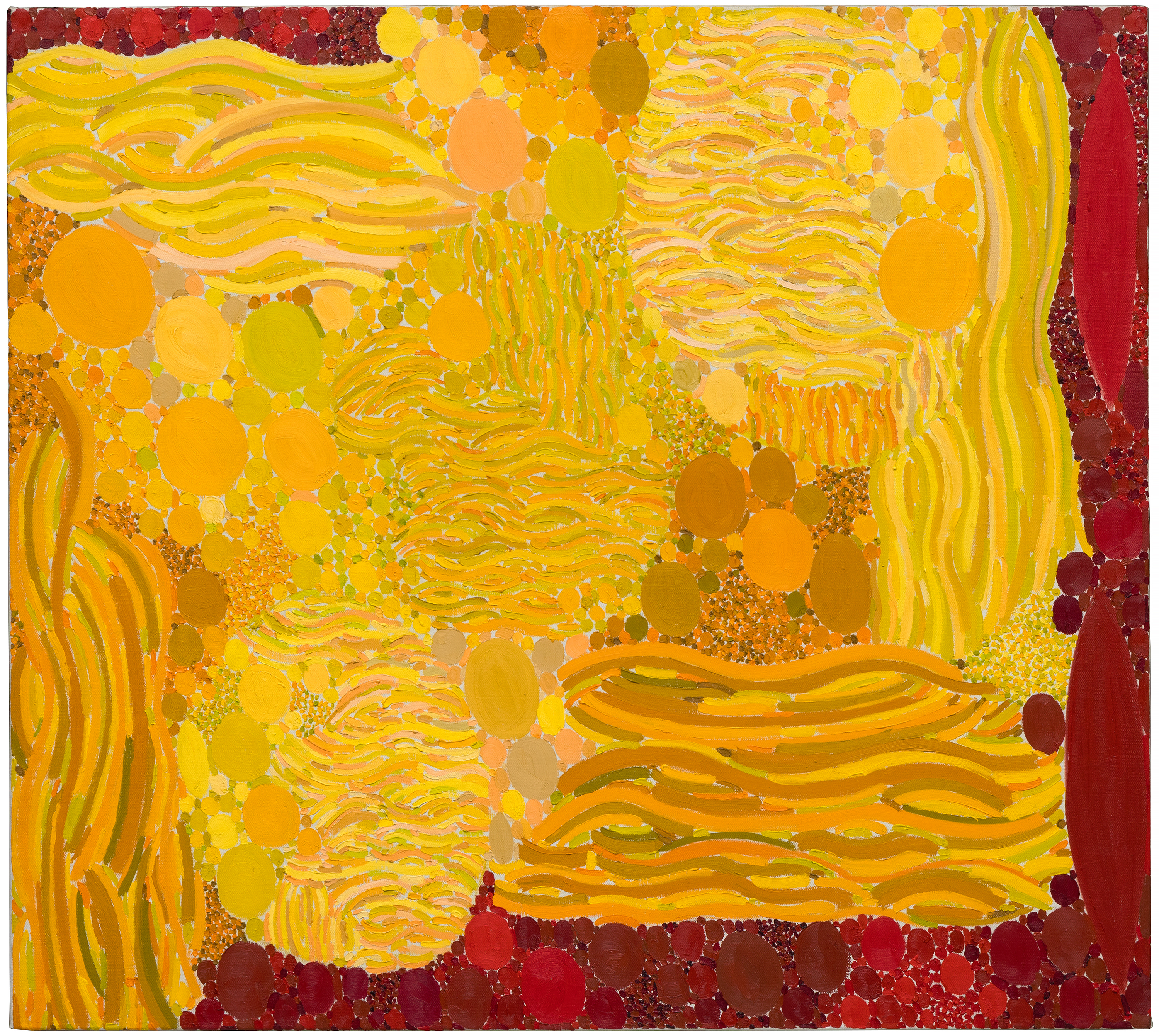 Lynne Mapp Drexler’s Spring Sun (1971) exemplifies the vibrant, lyrical abstraction that has brought her renewed recognition in recent years. Composed of concentric circles, cascading brushstrokes, and radiant hues of yellow, orange, and red, the canvas pulses with the rhythm of light and season. Drexler’s painterly vocabulary—layering gestural strokes over pointillist clusters—creates a dynamic surface that evokes both natural phenomena and musical structure, reflecting her lifelong love of symphonic composition.