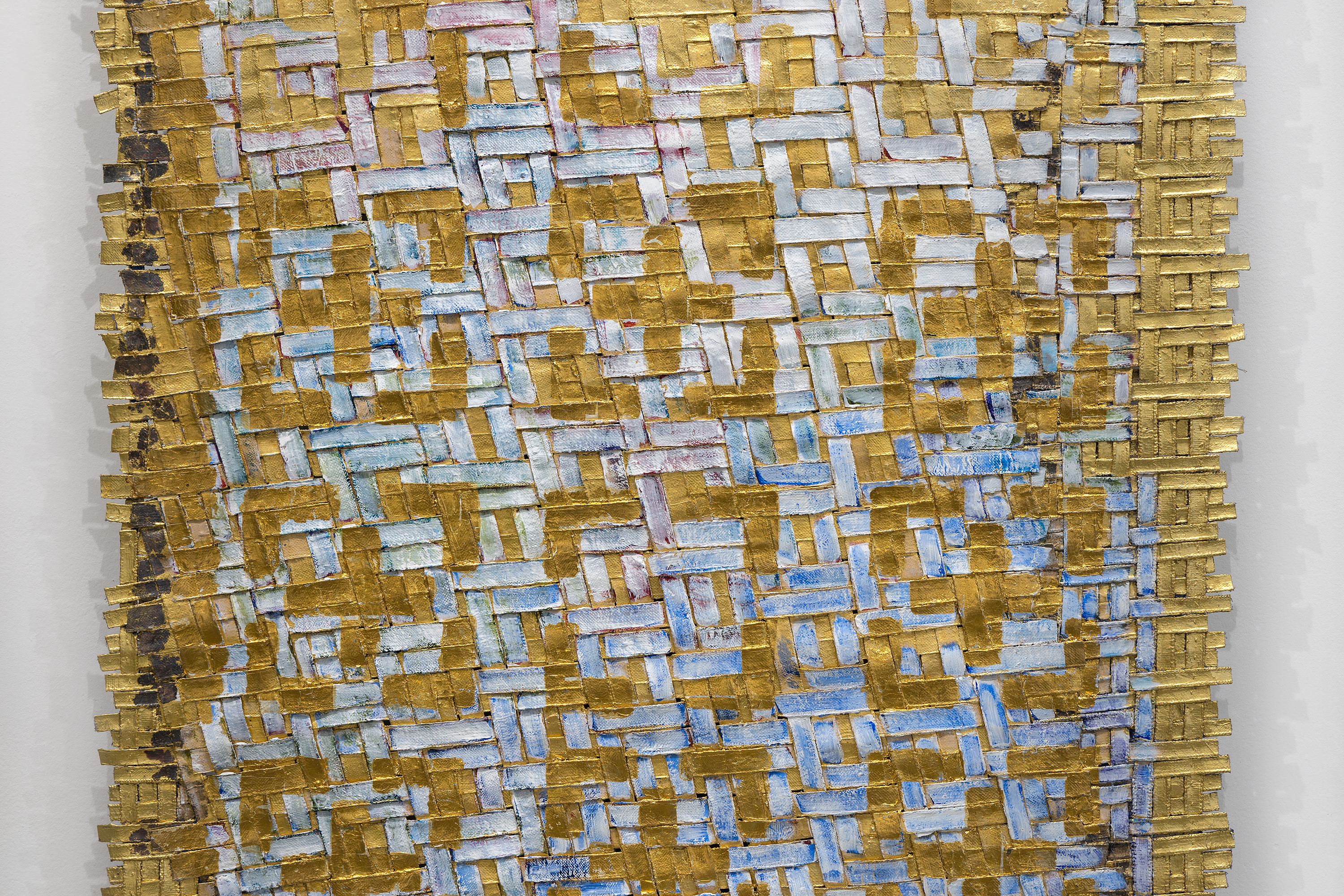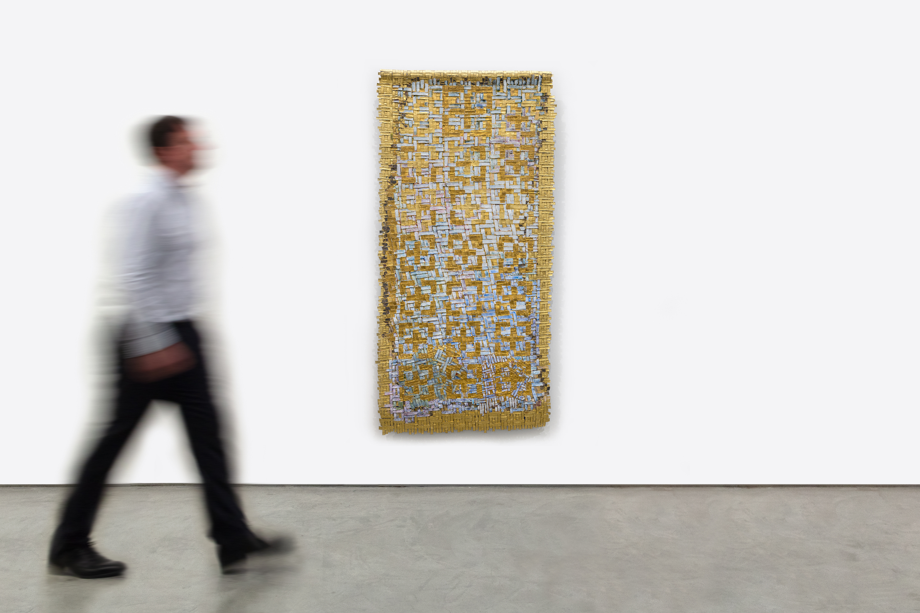 The Memento series, from which this piece belongs, explores memory as a layered, luminous presence. By embedding gold leaf within the weave, de Amaral connects her practice to pre-Columbian traditions in which gold was not a mere material but a carrier of spiritual and cultural meaning. In Memento 7, geometric patterning and a richly textured surface create a sense of sacred tapestry, collapsing distinctions between painting, sculpture, and textile.