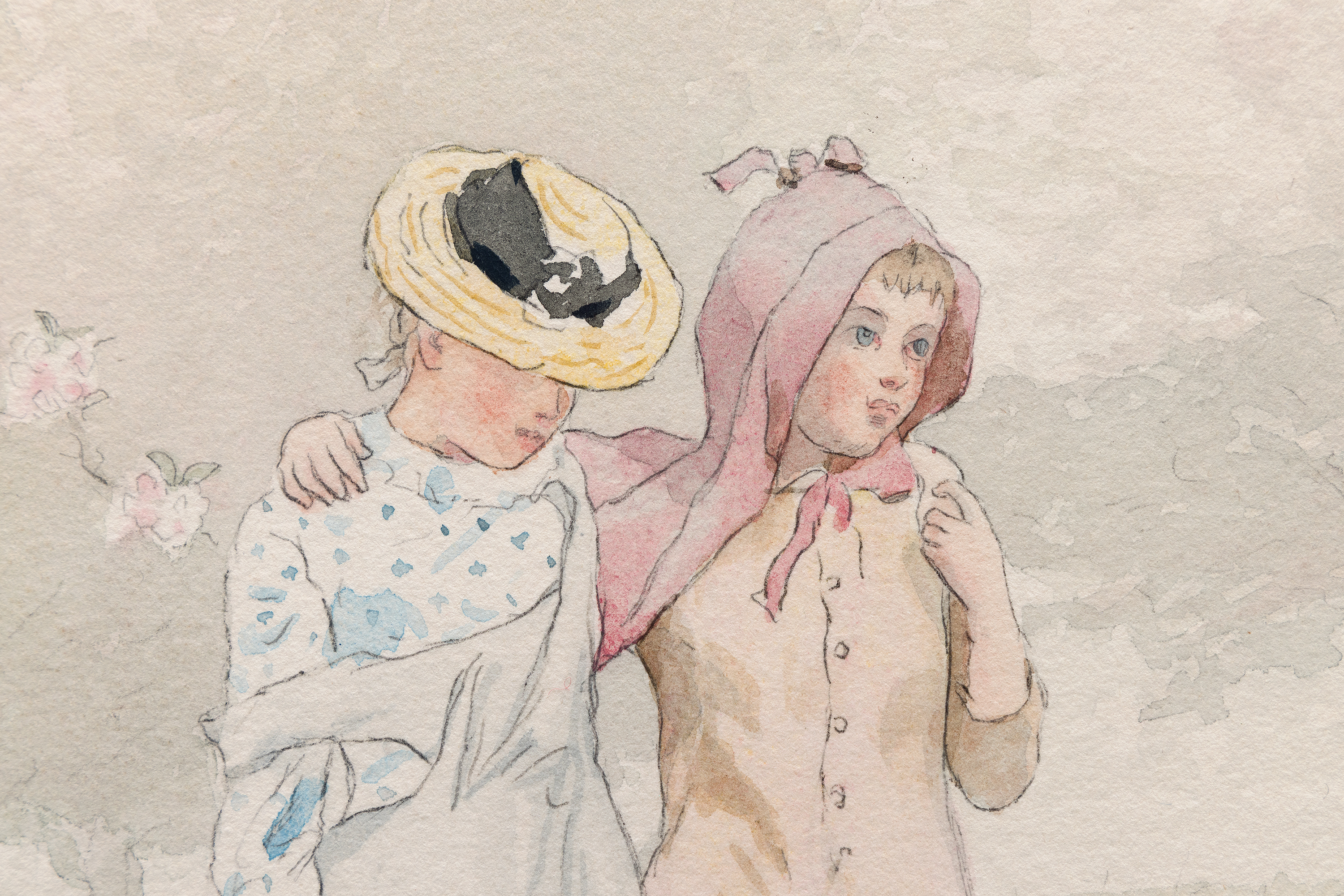 This watercolor is included in the artists catalogue raisonne and relates closely to other early examples from Houghton Farm, including Fresh Air from 1878 in the collection of the Brooklyn Museum. Its serene orchard scene, rendered with a soft and muted palette, reflects the themes of nostalgia, calm, and peace that define Homer's Restoration period. The transparency of the watercolor medium allows Homer to create a delicate, atmospheric impression of a misty morning, animated by touches of bright color in the figures dress patterns, the bow on a hat, a headwrap, and the bluebird perched on a branch.