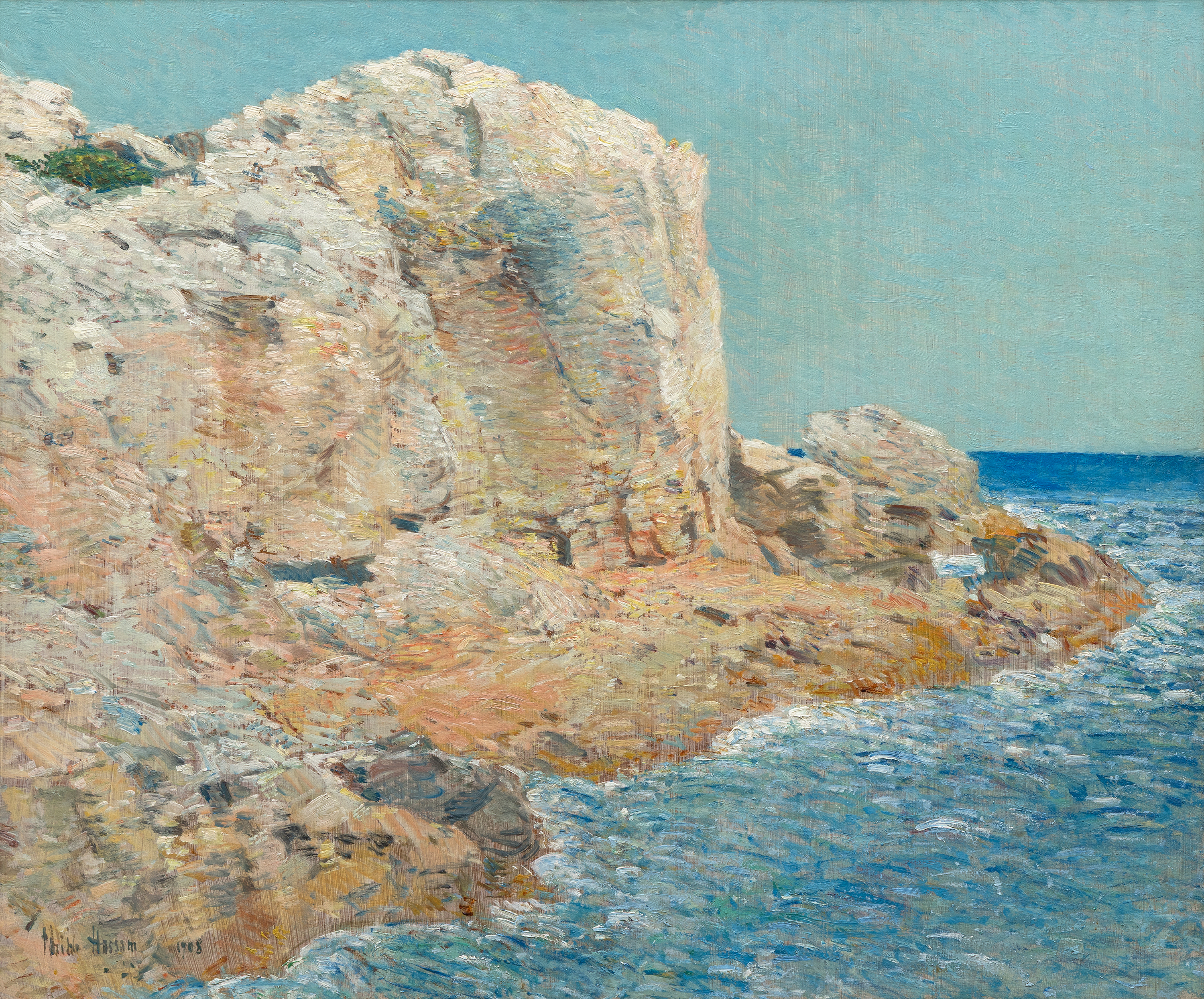In The Isle of Shoals, Hassam captures the clear northern light and the quiet splendor of the rocky coast, presenting a scene that reflects both the serenity of the islands and the artists deep connection to them.