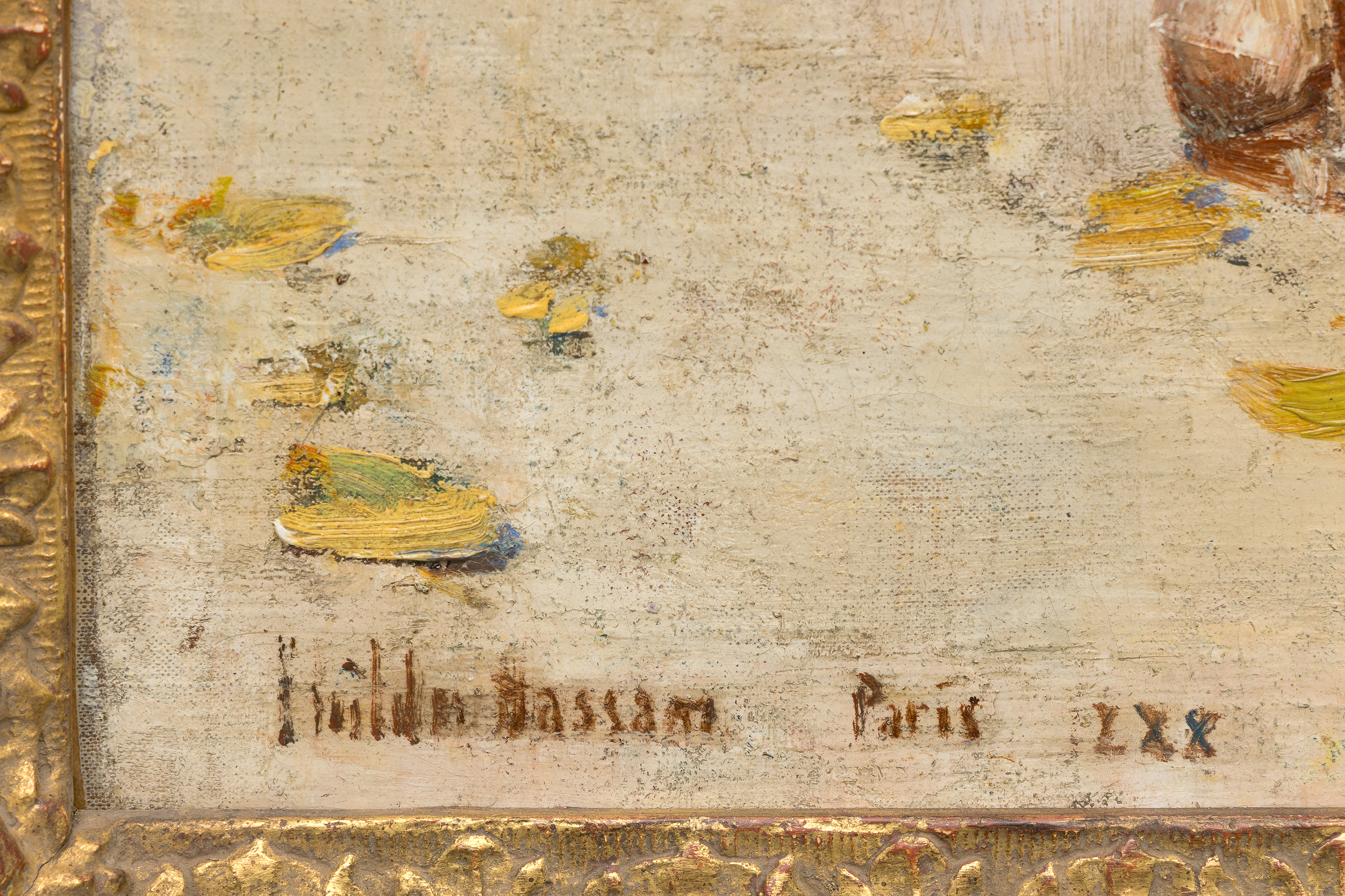 The painting reflects Hassam’s gift for portraying people interacting naturally with their surroundings, a hallmark of his finest works. Here he captures not only the activity of the booksellers but also the shifting atmosphere of the city itself, conveyed through soft dabs of paint that suggest autumn leaves floating gently through the air and settling along the foreground. This delicate blending of human presence, weather, and light reveals Hassam’s deep interest in the transient beauty of urban life and marks Booksellers by the Seine as an evocative example from an essential period in his artistic development.