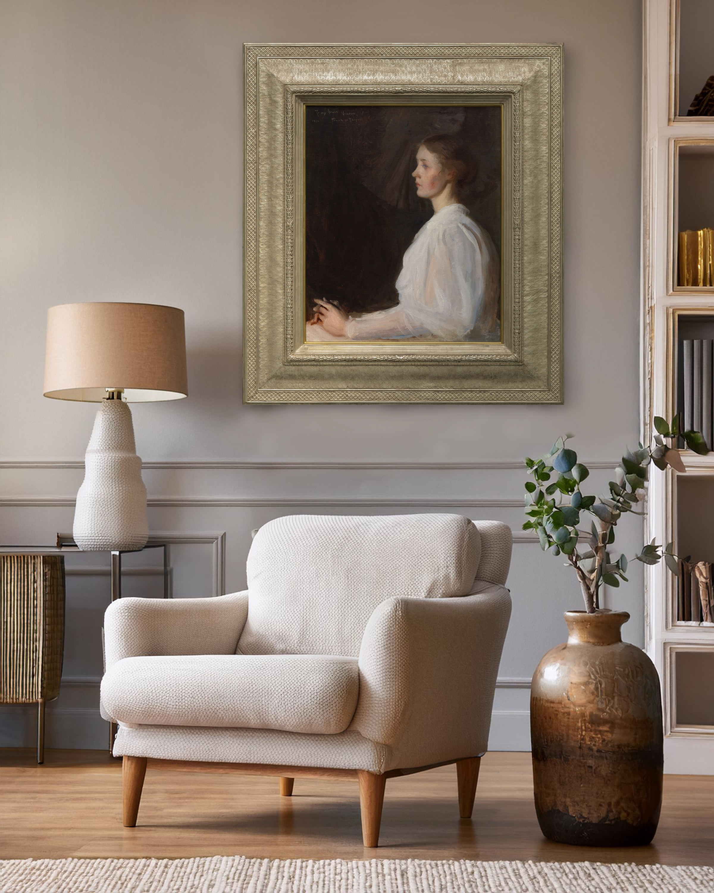 Together, these qualities reveal the depth of Bensons skill during the 1890s and affirm Girl in White (Seated Figure) as a beautifully preserved and emotionally resonant example of his portrait practice.