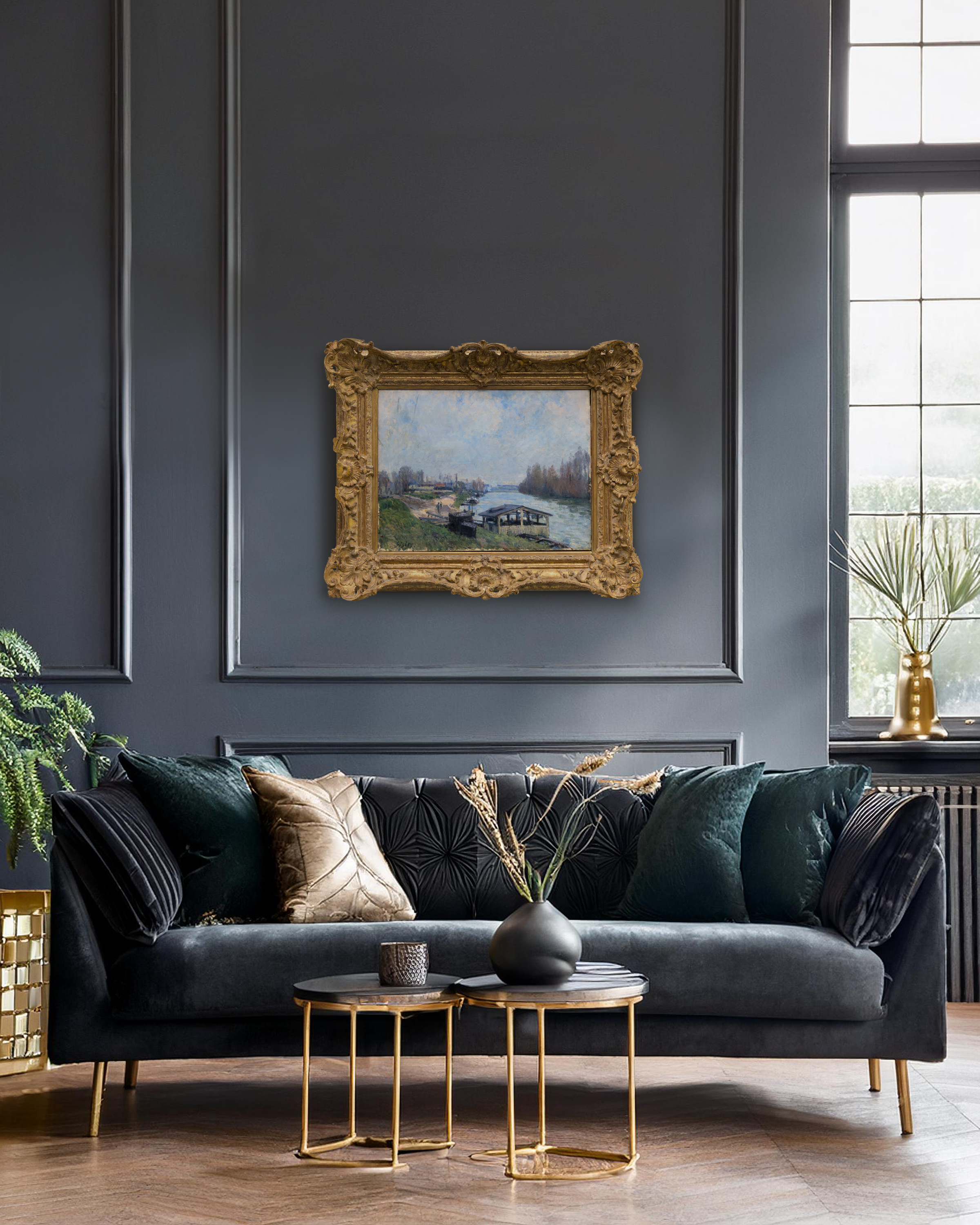 Painted along the Seine at Billancourt—an industrial town west of Paris—this work belongs to the sequence of views Sisley produced after the upheavals of 1871, when he moved his family first to Louveciennes and later to nearby Marly-le-Roi. The Seine valley offered him an ever-renewing motif: looping river bends, villages threaded along the banks, and a landscape marked by both history and modern life. Here, the floating washing house (a lavoir) sits low on the water, a practical structure where locals could wash clothes directly in the river for a small fee. Sisley transforms this everyday subject into an evocation of lived place, where human activity is integrated seamlessly into the broader rhythms of sky and current.