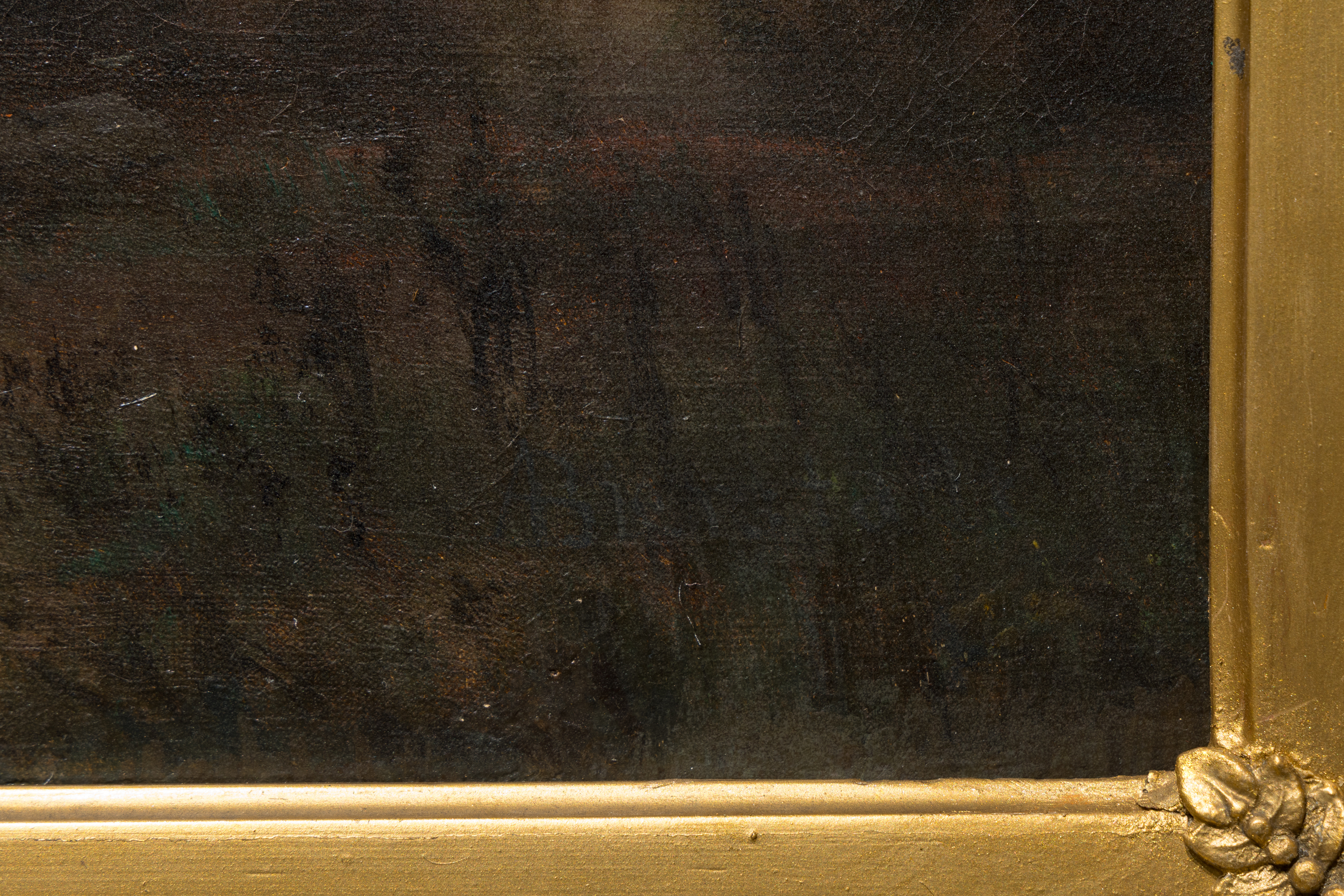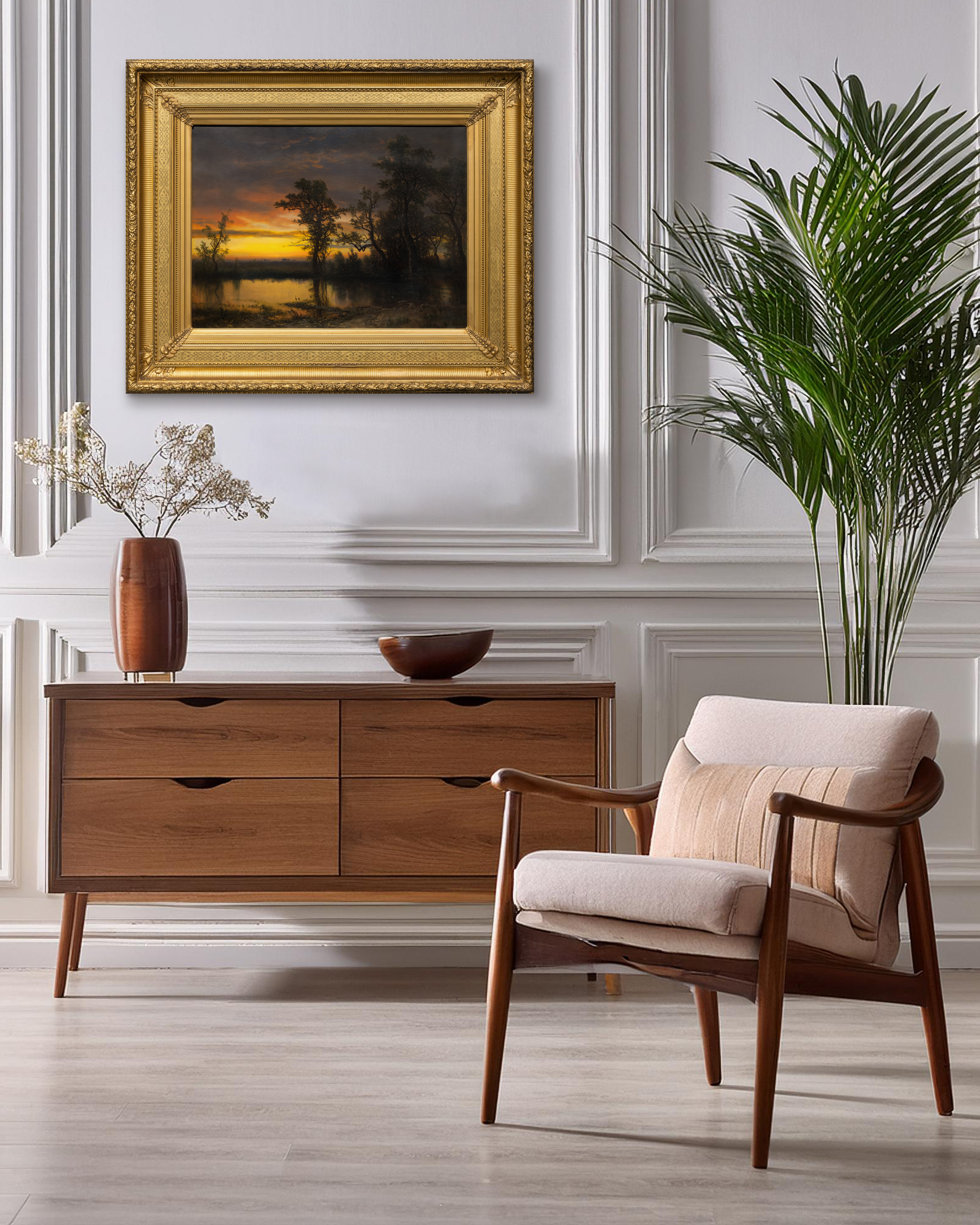 Twilight on the San Joaquin (c. 1873) is an oil painting that exemplifies Albert Bierstadt’s mature engagement with the American landscape and his mastery of light effects. Executed in a refined Luminist style, the work emphasizes a tranquil, glowing atmosphere achieved through meticulous detail, subtle tonal transitions, and a carefully controlled palette. The fading light of dusk settles gently over the scene, transforming the San Joaquin River into a reflective plane that anchors the composition and enhances its meditative stillness.