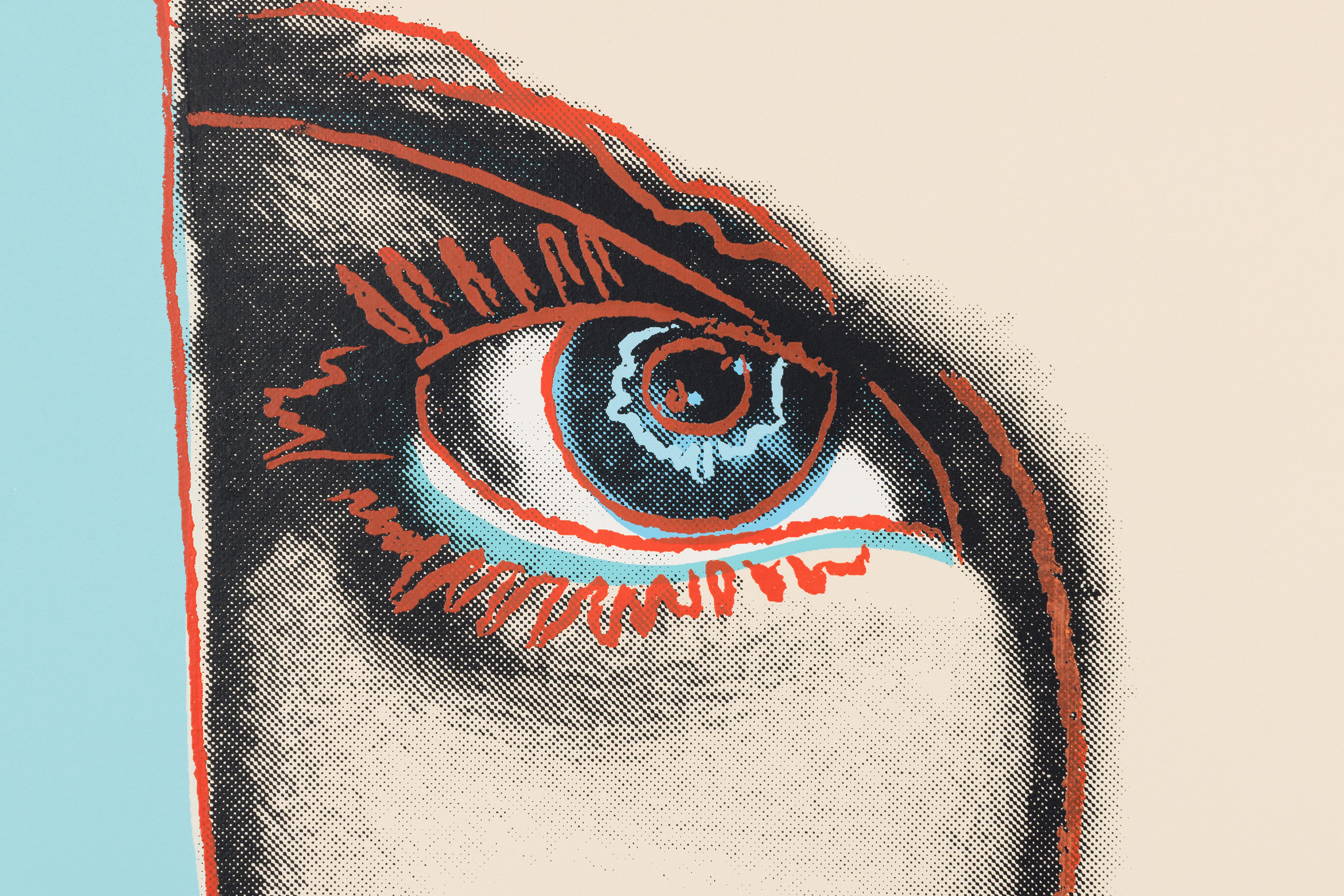 The image is based on a film still from Fourteen Hours (1951), Kelly’s screen debut, which Warhol reimagines through his signature Pop sensibility. By isolating and intensifying her features with vibrant color contrasts, he heightens both the glamour of the actress and the constructed nature of celebrity imagery. The turquoise background vibrates against Kelly’s luminous hair, underscoring Warhol’s mastery of color as a tool of both allure and abstraction.