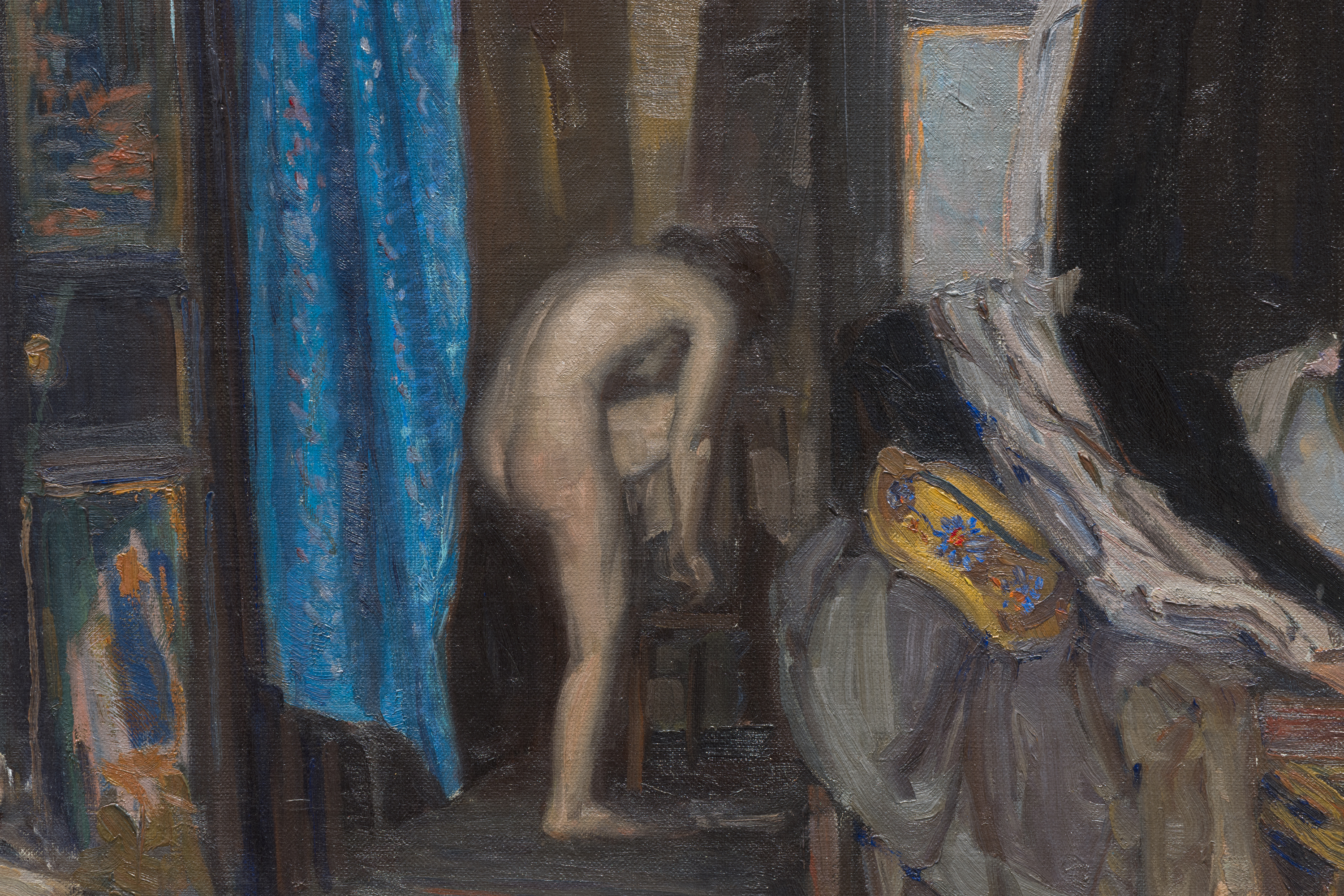 The interior is constructed with careful spatial logic and an emphasis on structure, underscoring Kleitsch’s preference for academic realism at this stage of his career. While in Chicago, his portrait and interior scenes were often distinguished by a “jeweled” palette—rich, saturated hues deployed with restraint—and that sensibility is evident here in the layered colors that enliven the otherwise low-keyed room. Subtle shifts in light guide the eye through the composition, balancing chromatic richness with solidity and calm.
