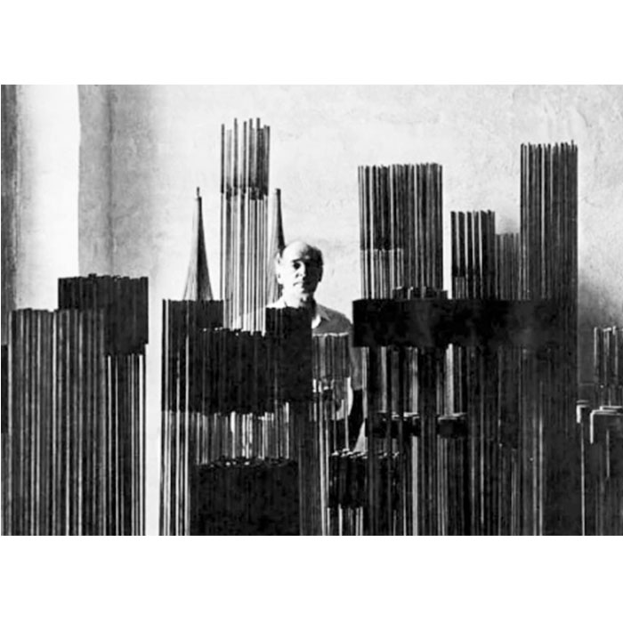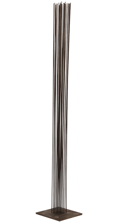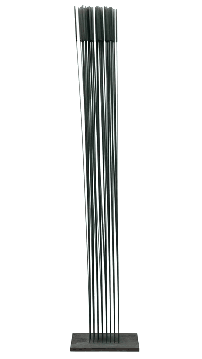 However, one of his most seminal series was the Sonambient or sounding sculptures. Conceived initially as sculptures resembling desert grasses, Bertoia discovered that their movement produced a harmonious sound. Following advice from his musician brother, Bertoia experimented in constructing these sculptures with different metals, lengths of rods, or capped by cylinders.