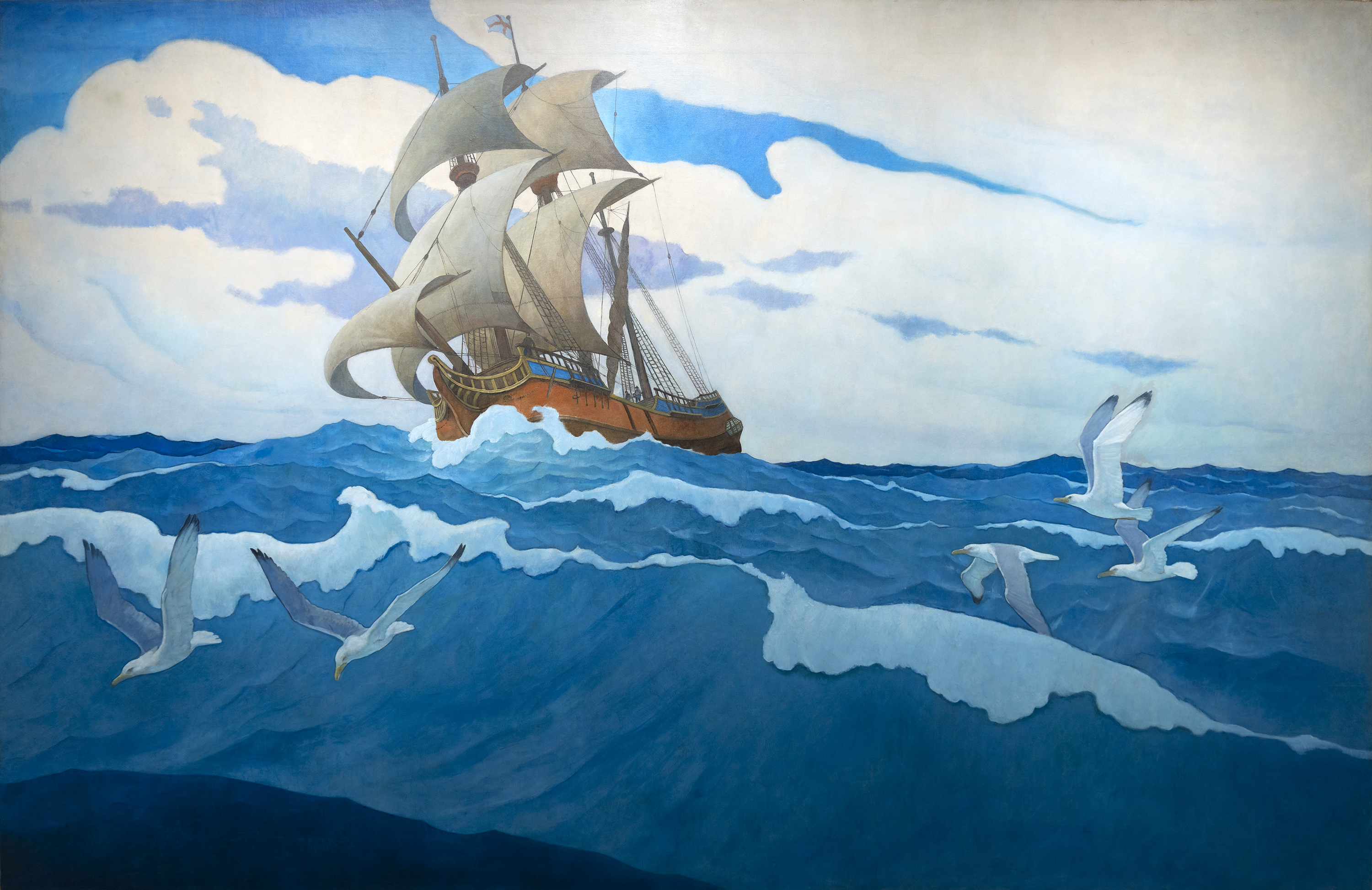 N.C. Wyeth, “The Coming of the Mayflower in 1620” (1941), oil on canvas, 104 1/2 x 158 3/4 in. On view in "N.C. Wyeth and the MetLife Murals", Heather James Palm Desert.